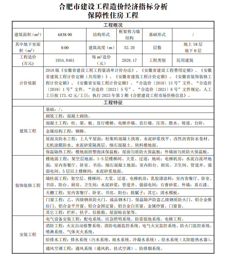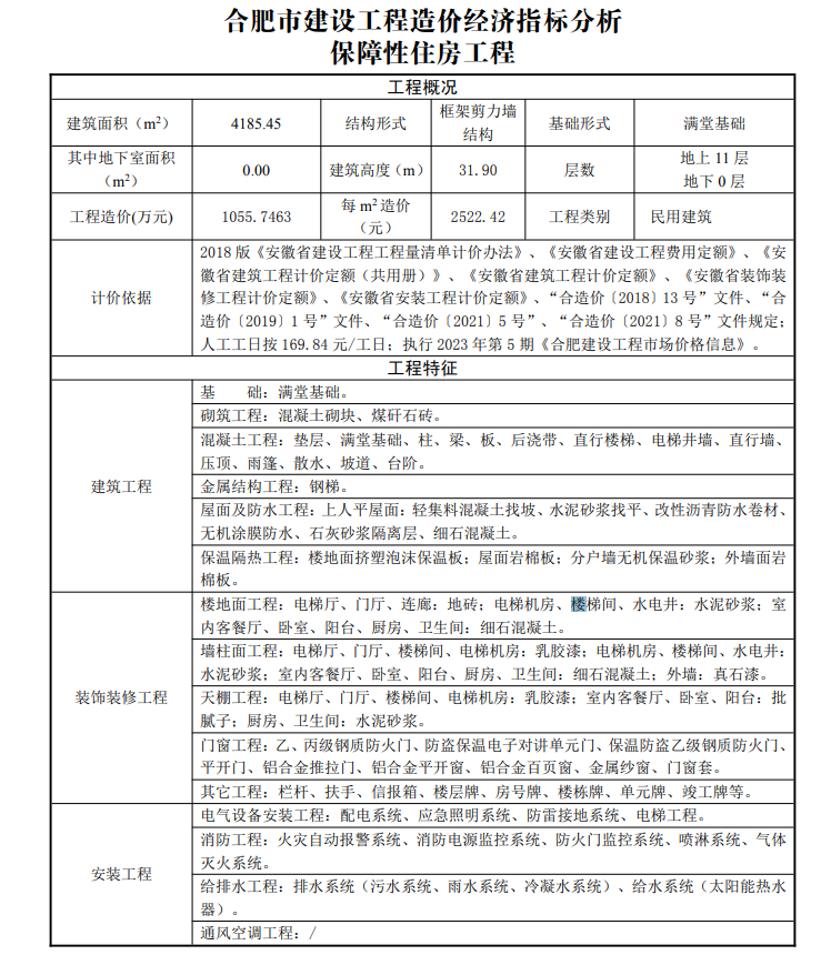 2023年5月合肥市建设工程造价经济指标分析--保障性住房工程