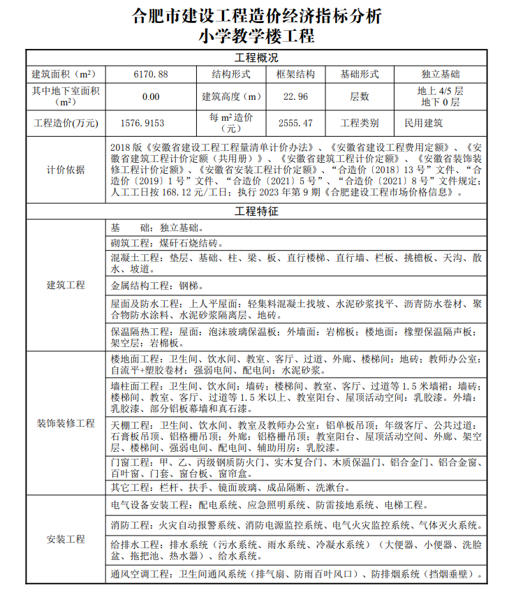 2023年11月合肥市建设工程造价经济指标分析--小学教学楼工程
