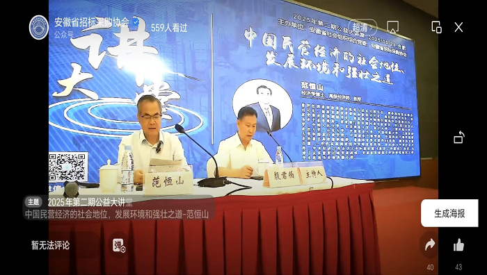 为深入学习贯彻习近平总书记关于民营经济发展的重要论述,全面贯彻《中华人民共和国民营经济促进法》,进一步提升我省各类市场主体对相关法规政策的理解与执行能力,推动我省民营经济高质量发展,安徽省发展改革委、安徽省招标采购协会2025年05月23日组织开展了“公益大讲堂”活动,竞技宝(JJB)官网带头积极参加,本次公益大讲堂内容深刻且富有意义,现将现场学习交流情况报道如下: